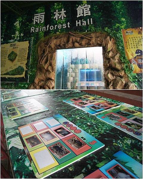 雨林館,將生物進化的過程透過展館的呈現,從水生到陸生動物,從陸生動物再到天空飛翔的昆蟲和鳥類整個演化並透過活動設計,經過化石的呈現,深入淺出讓大家更能認識生命的進化,也重視到生態的保育,以達到生態的平衡。也讓參觀的遊客藉由記憶大考驗遊戲過程中,認識更多生態故事及知識喔!!