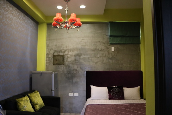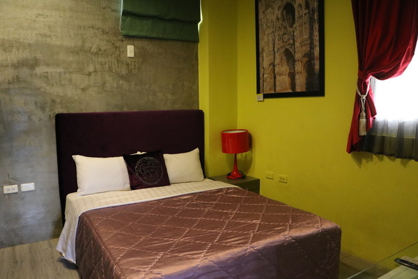一改民宿慣用的純白床單設計,1967選用浪漫的藕紫色床單,搭配仿清水模牆壁,與鮮紅色吊燈,展現低調奢華氣息。