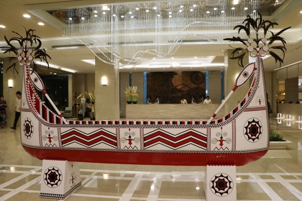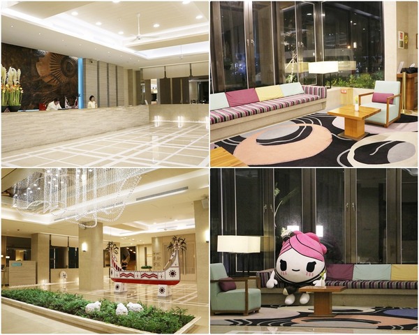 知本溫泉金聯世紀酒店大廳與交誼廳,每一個活動空間設計十分寬敞,還有舒適的沙發,四週使用落地玻璃設計,陽光可以直接灑進來,採光十分明亮舒適,中間還放了一艘達悟族的拼板舟,據說這艘拼板舟是用紙做出來的,好特別唷!!