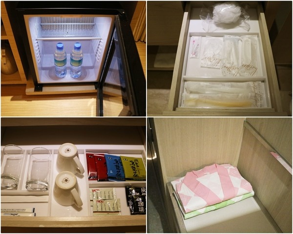 除了提供一般備品、礦泉水有冰、沒冰各2罐、阿里山茗茶,另外還有提供日式浴衣以及拖鞋,浴衣與拖鞋還可以直接穿上泡溫泉、吃早餐。