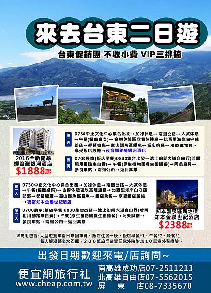 2天一夜台東後山溫泉金聯二日遊,有豪華舒適VIP三排座椅,深入台東私房景點,夜宿知本金聯溫泉大飯店,月光下夜訪小野柳生態,平日每人只要$2388即可成行,不但比自已開車去還便宜,又可免去長途開車旅遊的疲累唷!!