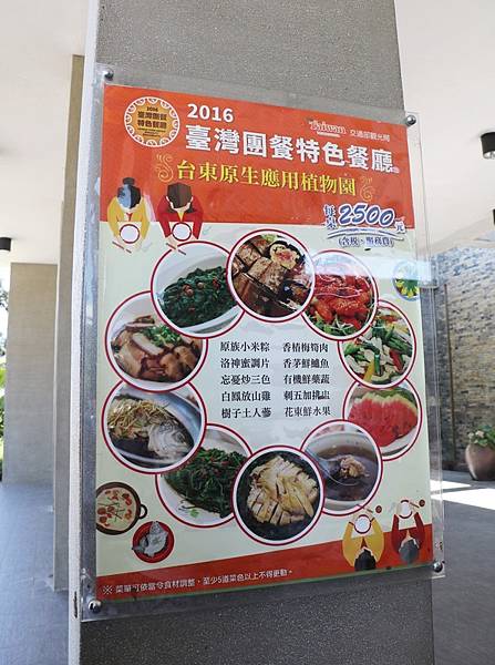 我們來原生應用植物園不吃火鍋,我們來享用得獎的特色餐唷。餐點有原住民的小米粽、香椿梅筍肉、刺五加排盅、鳳宮菜、香茅鮮鱸魚、有機鮮藥蔬、洛神蜜調片、忘憂炒三色、白鳳放山雞、樹子土人蔘以及花東鮮五果。