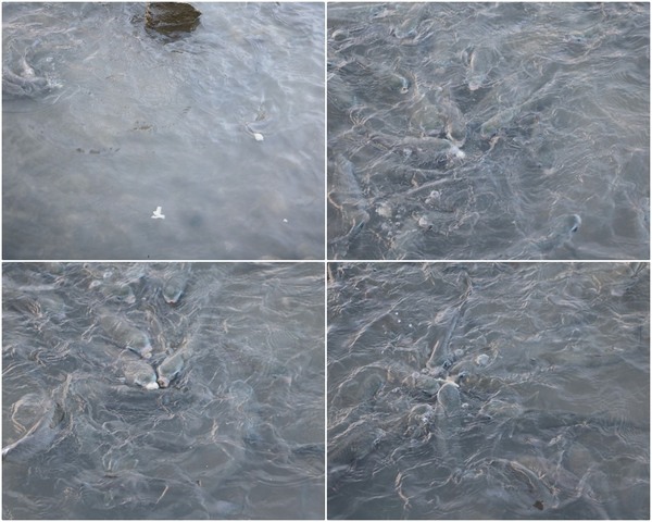 假日遊客好多喔,似乎還沒餵飽魚兒群們,才剛丟進饅頭,魚兒們蜂擁而上搶食,大嘴一開一合的,真是可愛呢!!