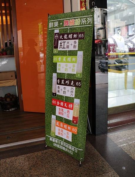 櫃台上方招牌標示推薦飲品,這些是鮮果舞一般現打果汁,除了綜合果汁,還有以金鑽鳳梨、木瓜、芭樂以及火龍果(紅)為基底下去調配消暑又健康飲品。